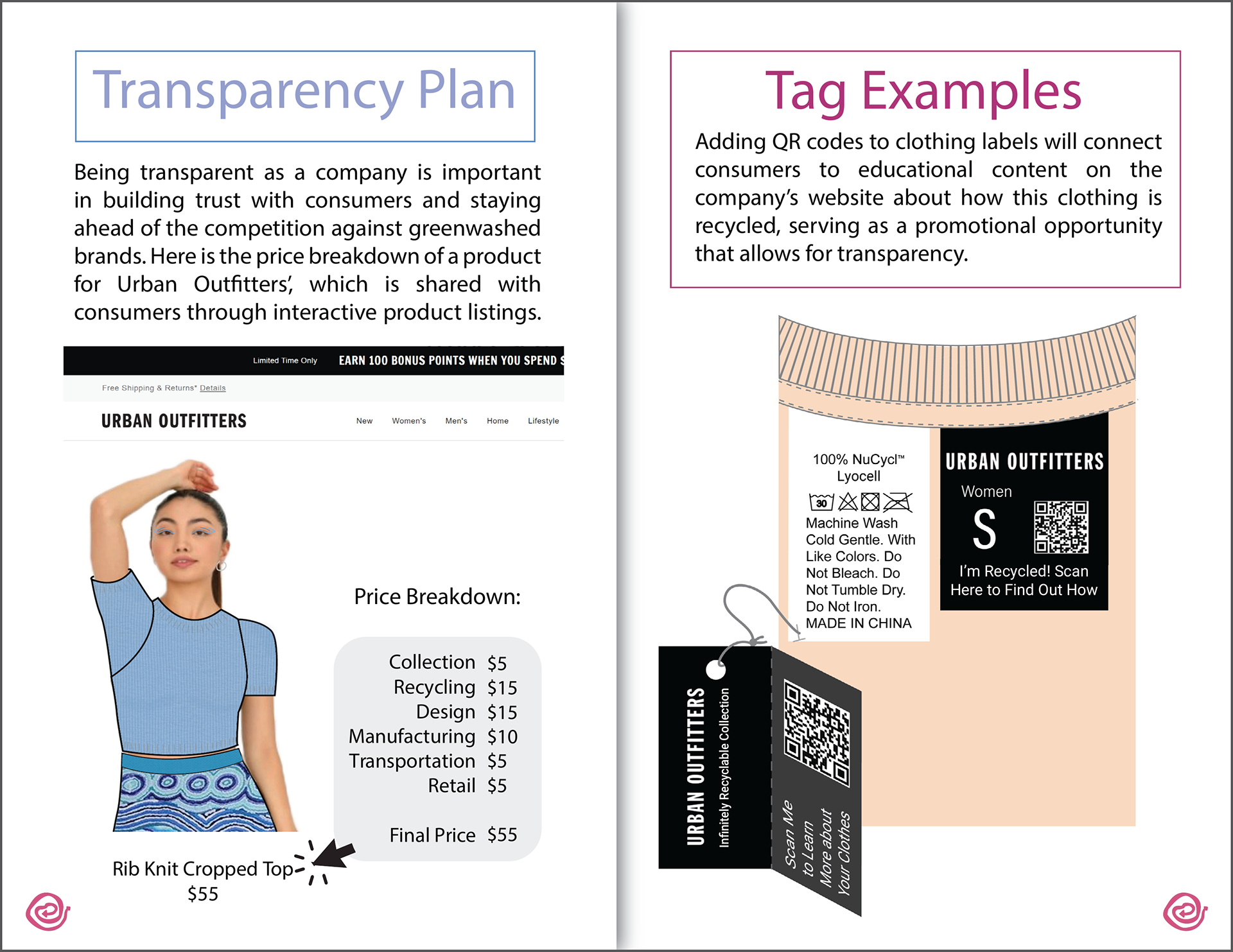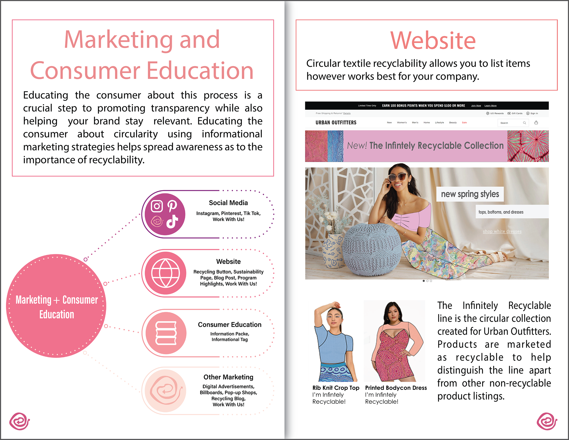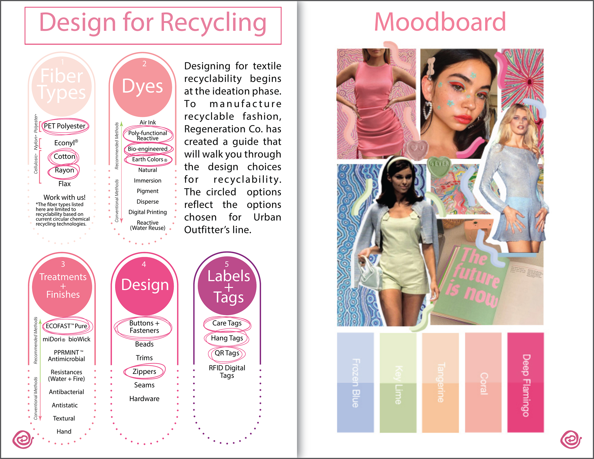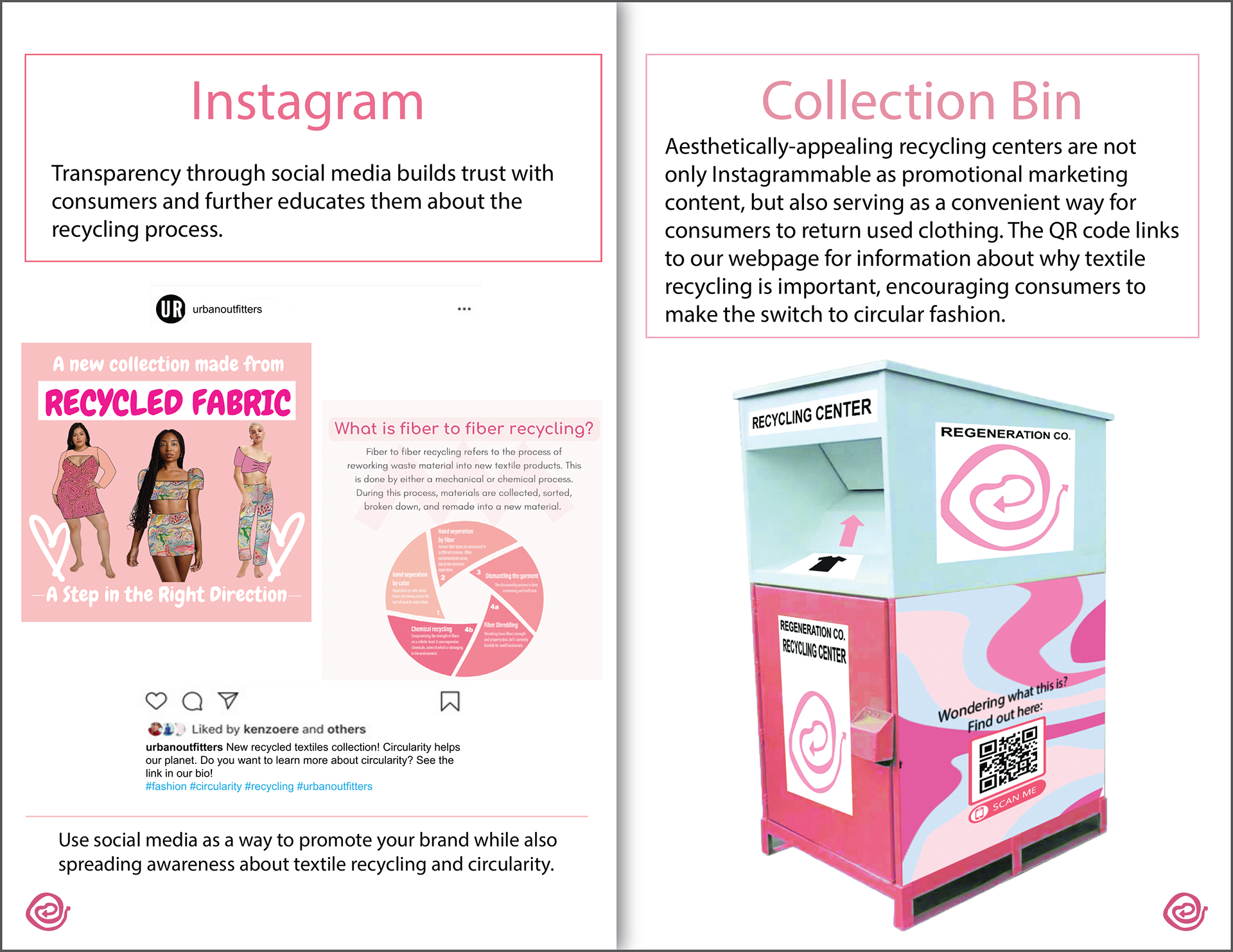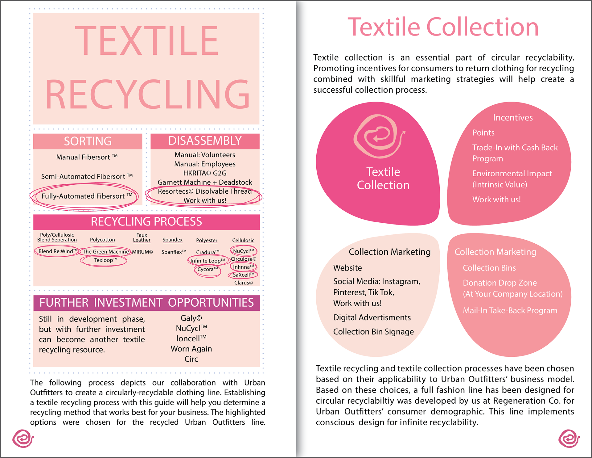The complexity of recycling processes impedes on the introduction of circular production models across the apparel industry. This project introduces a way for apparel companies to navigate and implement fiber-to-fiber recycling solutions. Incorporating sustainable practices into our current economical model is complex, nubilous, and often costly. Using the circular economy as a guiding principle, this comprehensive systems design project explores real-world solutions for recycling old textiles into new fabrics while increasing Return on Sustainability Investment (ROSI).