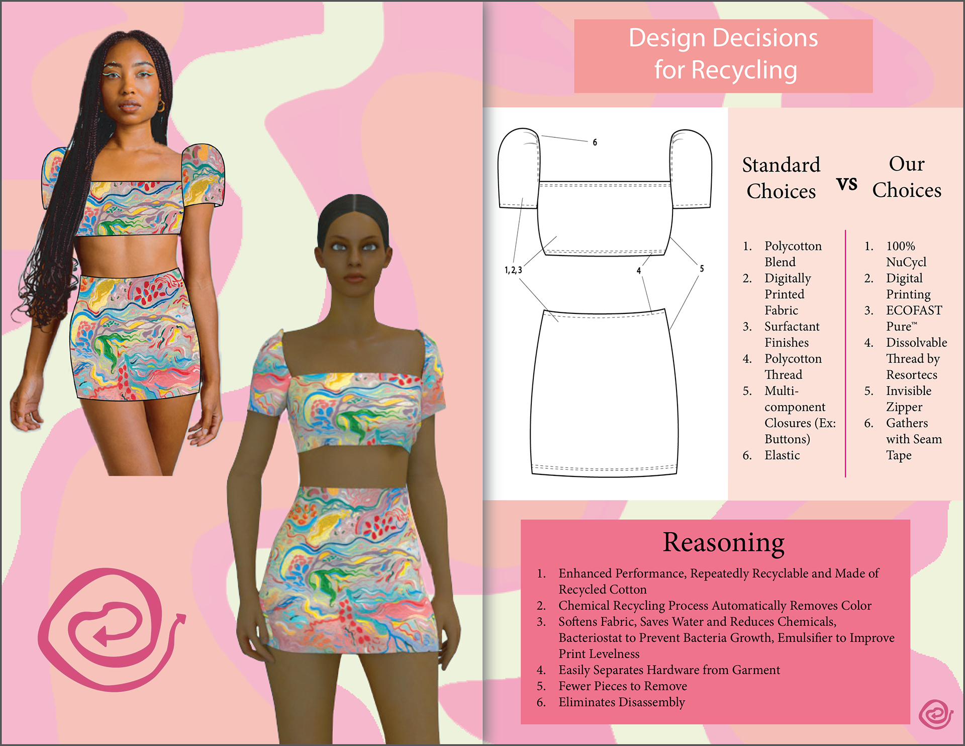 // Provide real-world, realistic solutions for apparel brands today/ Introduce recycling solutions that benefit corporate objectives without sacrificing sustainability / Offer solutions applicable to a range of current unsustainable practices within the apparel industry //